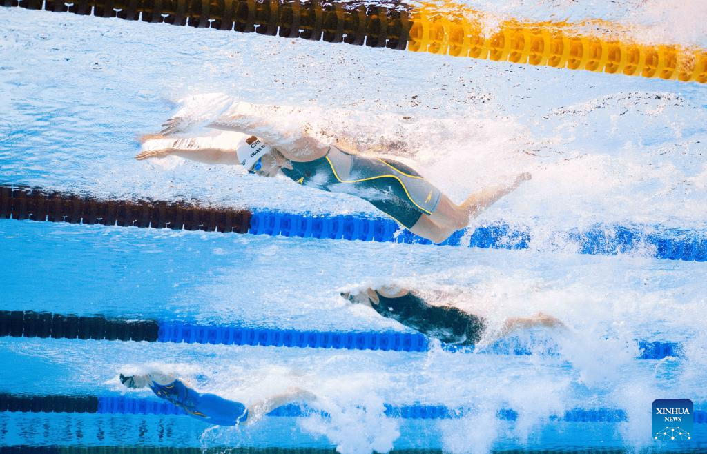 Tang Qianting (R) of China competes during the women's 4X100m medley relay final of swimming at the World Aquatics Championships in Singapore, Aug. 3, 2025. (Xinhua/Xue Yuge)