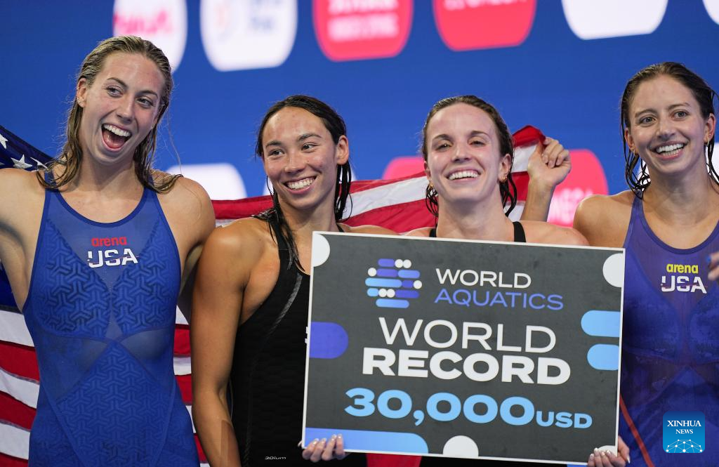 SINGAPORE, Aug. 3 (Xinhua) -- The United States brought the World Aquatics Championships to a thrilling close on Sunday by breaking the world record in the women's 4x100 meters medley relay - the final event of the meet.