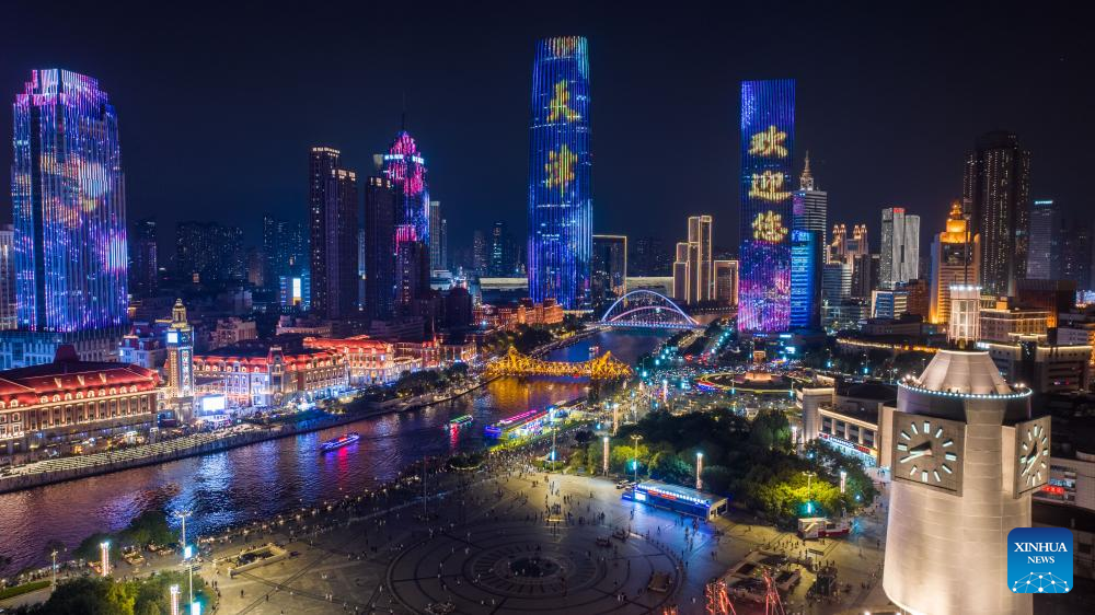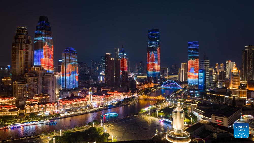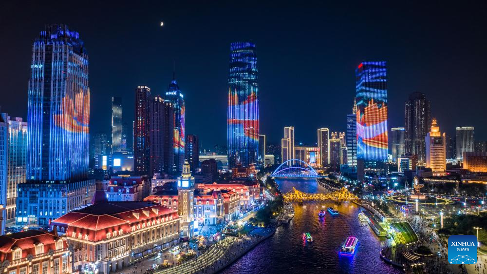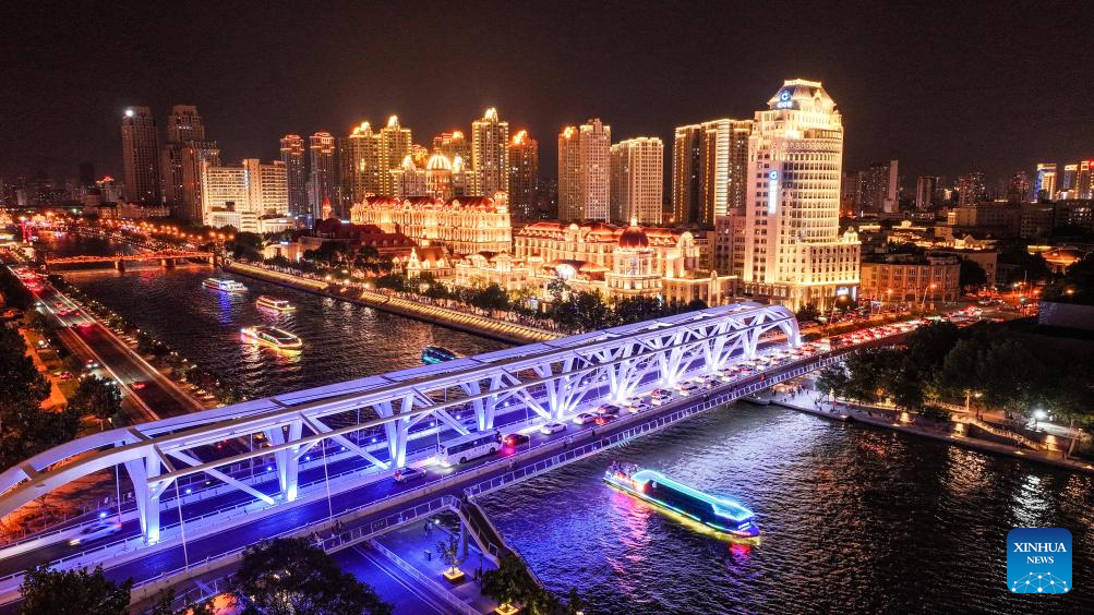 A drone photo taken on July 19, 2025 shows cruise ships sailing on the Haihe River in north China's Tianjin. To improve its urban landscape at night, Tianjin has upgraded the lighting installations for 216 buildings, 13 bridges, 8.2 kilometers of riverbanks and 7 piers along the Haihe River so far in 2025. (Xinhua/Sun Fanyue)