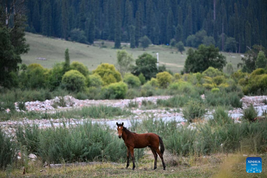 A horse is pictured at Koldeneng in Gongliu County of Ili Kazak Autonomous Prefecture, northwest China's Xinjiang Uygur Autonomous Region, on Aug. 2, 2025. (Xinhua/Xin Yuewei)