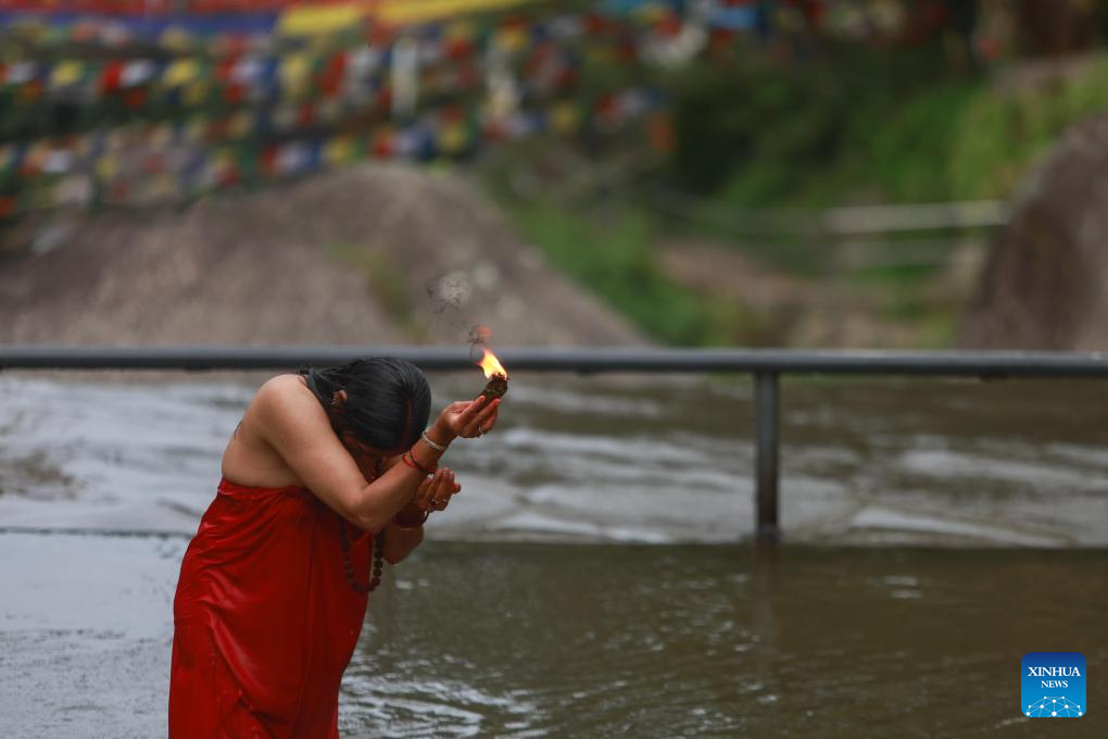 A devotee offers prayers during the Bol Bom pilgrimage in Kathmandu, Nepal, Aug. 4, 2025. (Photo by Sulav Shrestha/Xinhua)