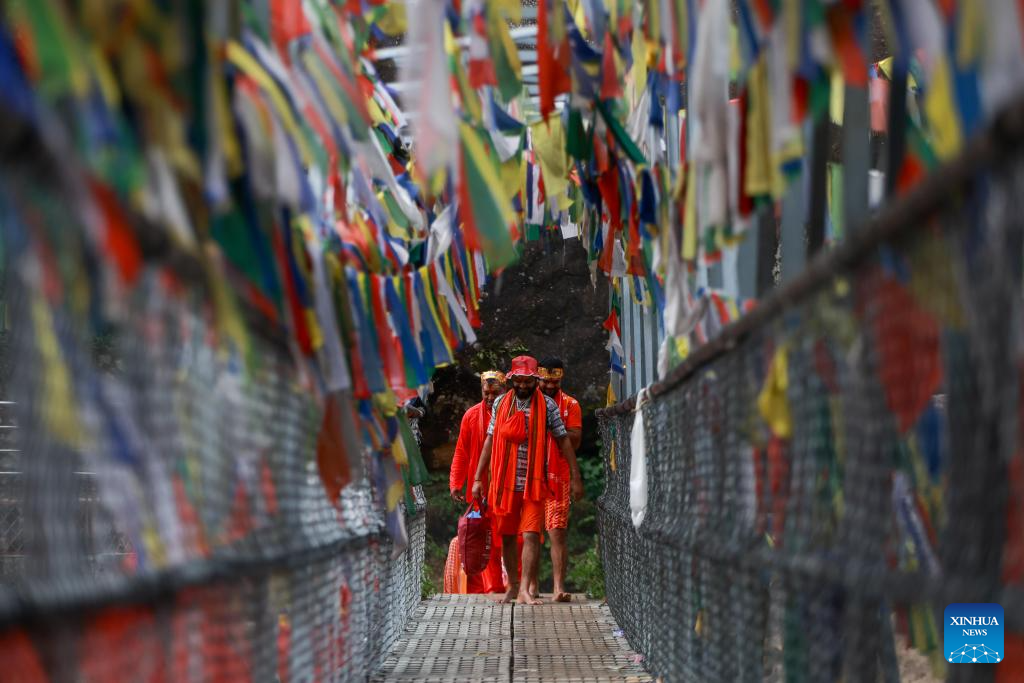 Devotees are seen during the Bol Bom pilgrimage in Kathmandu, Nepal, Aug. 4, 2025. (Photo by Sulav Shrestha/Xinhua)