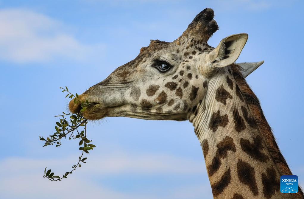 A giraffe feeds on leaves in the Masai Mara National Reserve in Kenya, on July 30, 2025. (Xinhua/Han Xu)