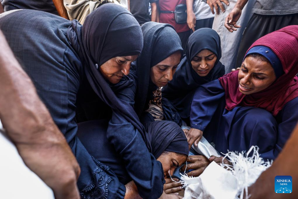 Palestinians mourn for a victim killed in an Israeli airstrike, at a hospital in Gaza City, on Aug. 4, 2025. A total of 35 Palestinians were killed on Monday in Israeli shelling and gunfire across Gaza, at least 12 of those while waiting for humanitarian aid, according to the Gaza Civil Defense. (Photo by Mahmoud Zaki/Xinhua)