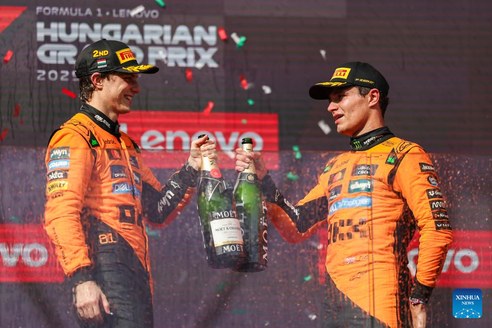 First placed McLaren's British driver Lando Norris (L) celebrates during the awarding ceremony after the race of the Formula One Hungarian Grand Prix at the Hungaroring in Mogyorod, near Budapest, Hungary, on Aug. 3, 2025. (Photo by Qian Jun/Xinhua)