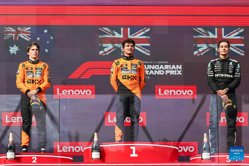 First placed McLaren's British driver Lando Norris (C), second placed McLaren's Australian driver Oscar Piastri (L) and third placed Mercedes' British driver George Russell pose during the awarding ceremony after the race of the Formula One Hungarian Grand Prix at the Hungaroring in Mogyorod, near Budapest, Hungary, on Aug. 3, 2025. (Photo by Qian Jun/Xinhua)