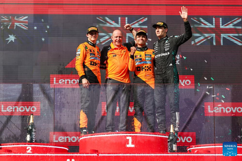 First placed McLaren's British driver Lando Norris (2nd R), second placed McLaren's Australian driver Oscar Piastri (1st L) and third placed Mercedes' British driver George Russell (1st R) pose during the awarding ceremony after the race of the Formula One Hungarian Grand Prix at the Hungaroring in Mogyorod, near Budapest, Hungary, on Aug. 3, 2025. (Photo by Qian Jun/Xinhua)