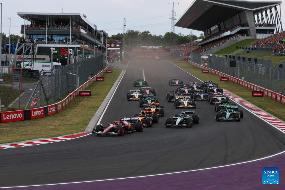 Racers compete during the race of the Formula One Hungarian Grand Prix at the Hungaroring in Mogyorod, near Budapest, Hungary, on Aug. 3, 2025. (Photo by Attila Volgyi/Xinhua)