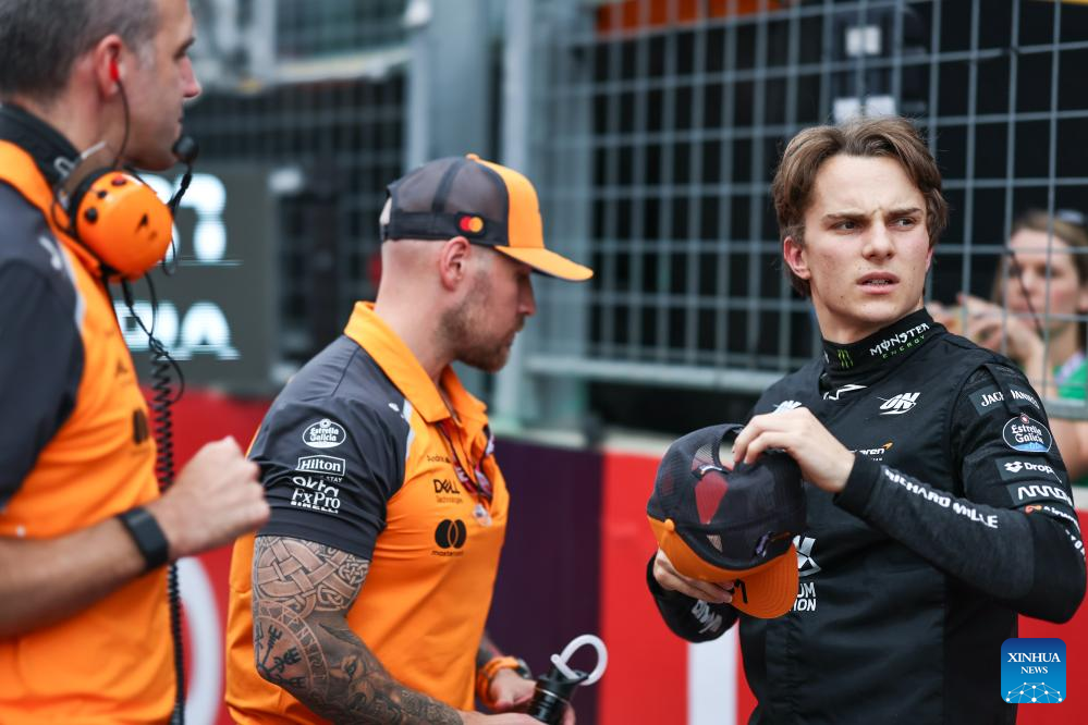 McLaren's Australian driver Oscar Piastri (R) reacts before the race of the Formula One Hungarian Grand Prix at the Hungaroring in Mogyorod, near Budapest, Hungary, on Aug. 3, 2025. (Photo by Qian Jun/Xinhua)