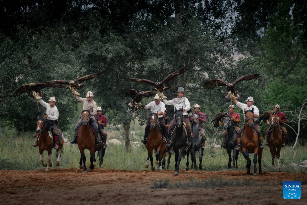 People participate in a hunting performance during a folk arts festival at the south bank of the Issyk-Kul Lake, Kyrgyzstan, Aug. 2, 2025. (Xinhua)