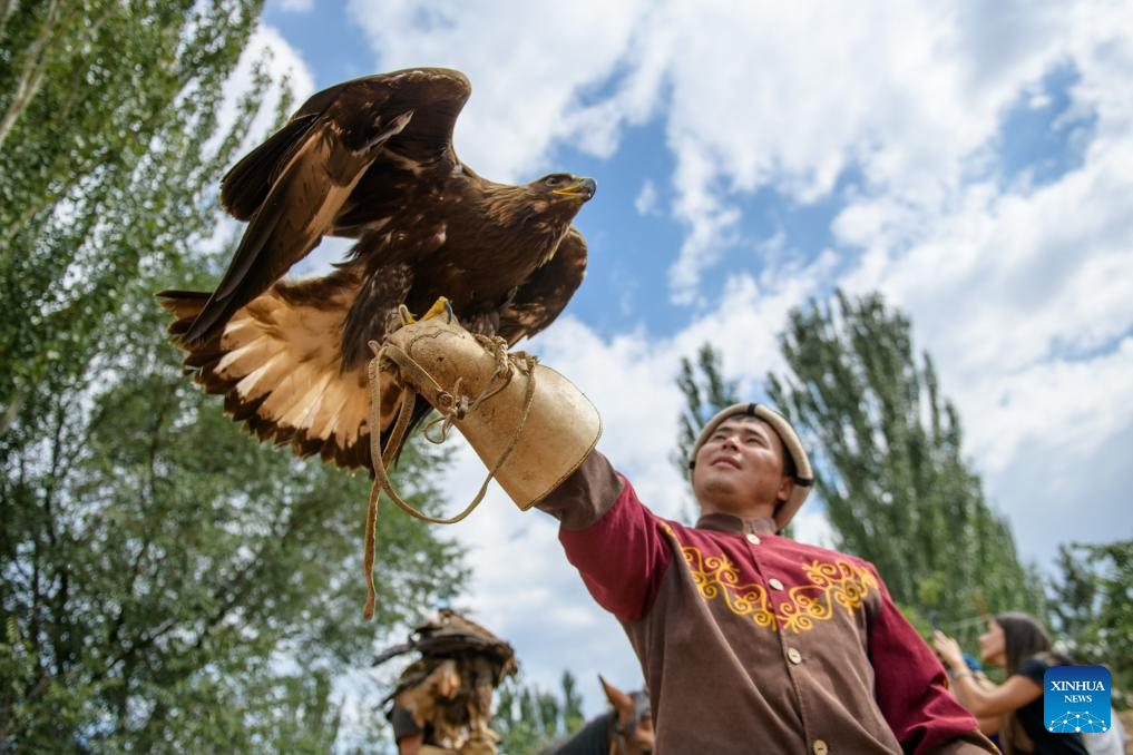 A man participates in a hunting performance during a folk arts festival at the south bank of the Issyk-Kul Lake, Kyrgyzstan, Aug. 2, 2025. (Xinhua)