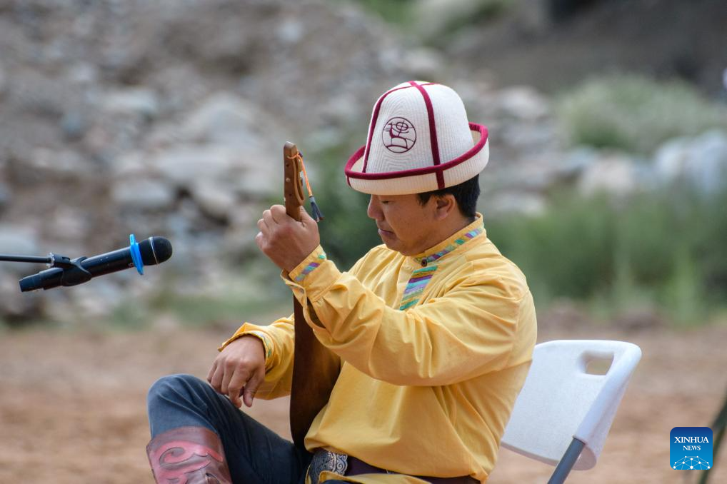 A man plays traditional musical instruments during a folk arts festival at the south bank of the Issyk-Kul Lake, Kyrgyzstan, Aug. 2, 2025. (Xinhua)