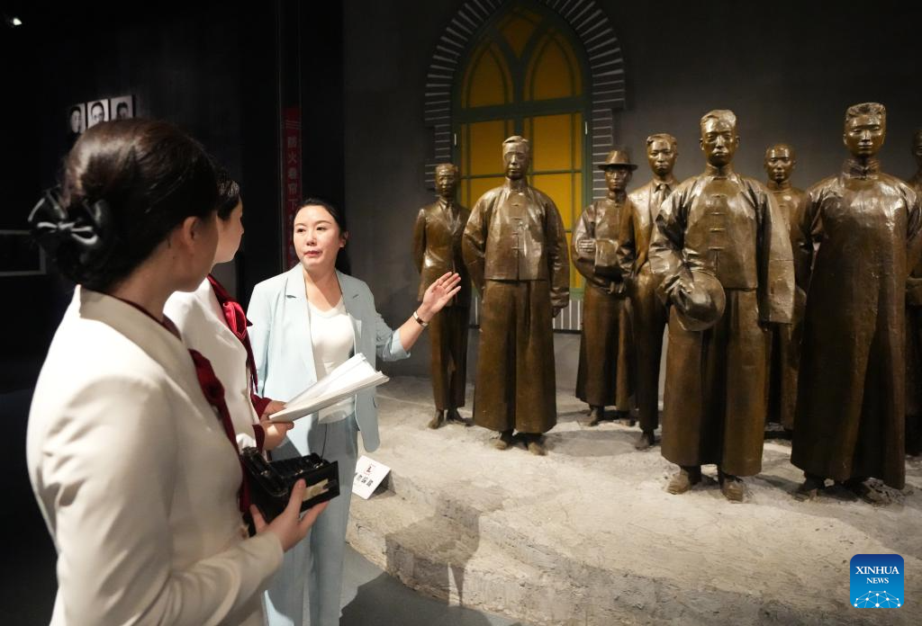 Shi Renhua (1st L) and her colleagues check exhibits at the 9.18 Historical Museum in Shenyang, northeast China's Liaoning Province, July 28, 2025. Shi Renhua, head of public education service at the 9.18 Historical Museum in Shenyang, has devoted herself into study of historical documents as well as editorial projects since she joined the museum in 1999.