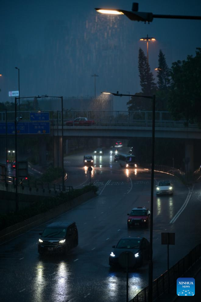 Cars drive amid rains on a street in Hong Kong, south China, Aug. 5, 2025. The Hong Kong Observatory on Tuesday morning issued the black rainstorm warning signal, the fourth time within eight days.