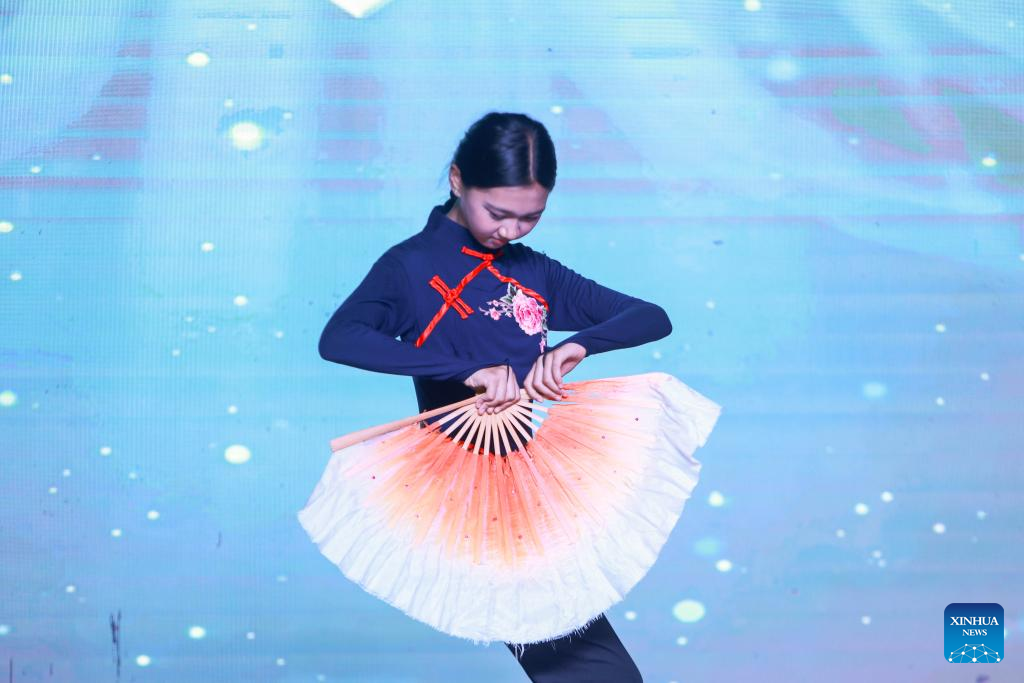A contestant performs during the 11th Chinese culture talent competition for Nepali students in Kathmandu, Nepal, on Aug. 5, 2025. The 11th Chinese culture talent competition for Nepali students was held here on Tuesday. Nearly 300 contestants demonstrated their talents through 10 Chinese songs and 10 Chinese modern and classic dances, drawing a frequent outburst of cheers and applause from the audience. (Photo by Sulav Shrestha/Xinhua)