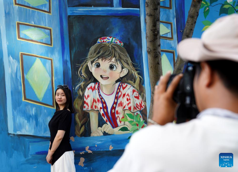 A tourist poses for photos with a painted wall in Yining City of Ili Kazak Autonomous Prefecture, northwest China's Xinjiang Uygur Autonomous Region, Aug. 4, 2025. Ili Kazak Autonomous Prefecture has ushered in its peak tourism period. The region's unique natural landscapes and cultural sites have attracted a large number of visitors. It received 54.93 million domestic tourists in the first seven months of this year, a year-on-year increase of 10.31 percent. (Xinhua/Liu Lianfen)