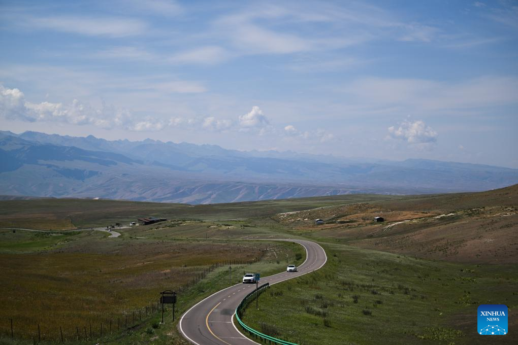 Vehicles travel on a road at Kalajun grassland in Tekes County of Ili Kazak Autonomous Prefecture, northwest China's Xinjiang Uygur Autonomous Region, Aug. 1, 2025. Ili Kazak Autonomous Prefecture has ushered in its peak tourism period. The region's unique natural landscapes and cultural sites have attracted a large number of visitors. It received 54.93 million domestic tourists in the first seven months of this year, a year-on-year increase of 10.31 percent. (Xinhua/Xin Yuewei)