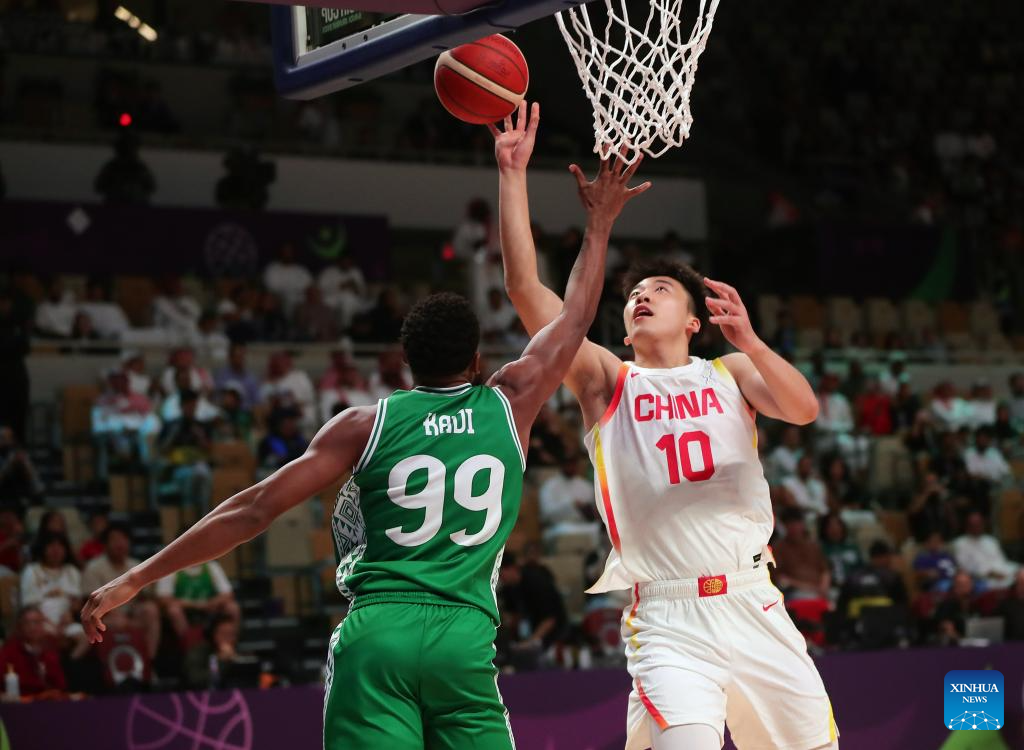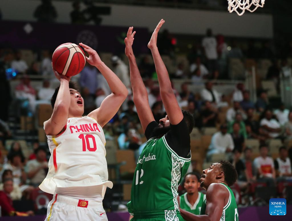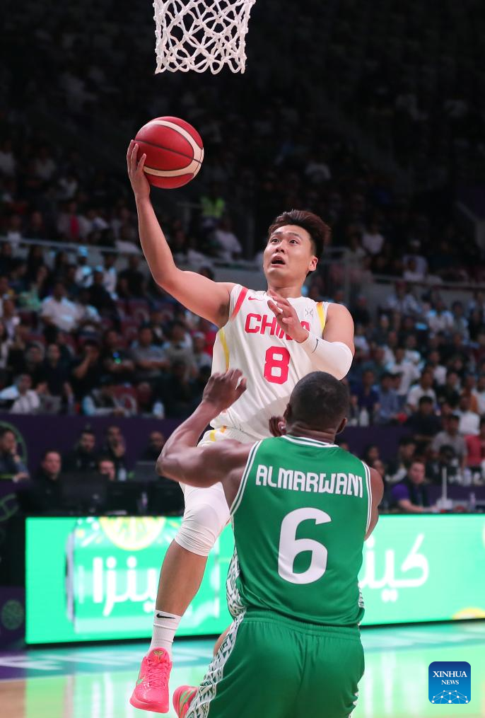 Zhao Rui (L) of China goes up to make a basket during the Group C match between China and Saudi Arabia at the FIBA Asia Cup 2025 in Jeddah, Saudi Arabia, Aug. 5, 2025. (Xinhua/Wang Dongzhen)