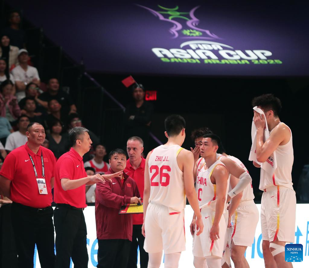 China's coach Guo Shiqiang (2nd L) instructs during the Group C match between China and Saudi Arabia at the FIBA Asia Cup 2025 in Jeddah, Saudi Arabia, Aug. 5, 2025. (Xinhua/Wang Dongzhen)