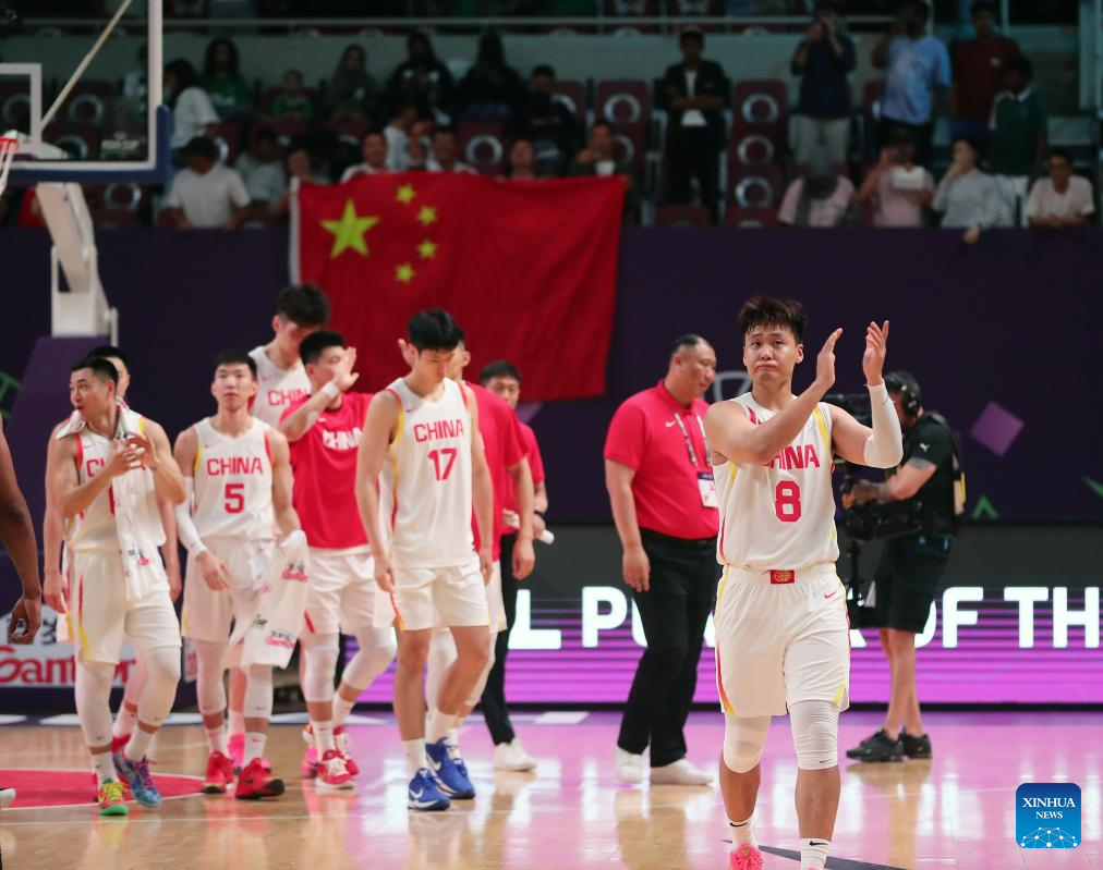 Zhao Rui (front) of China greets the spectators after the Group C match between China and Saudi Arabia at the FIBA Asia Cup 2025 in Jeddah, Saudi Arabia, Aug. 5, 2025. (Xinhua/Wang Dongzhen)