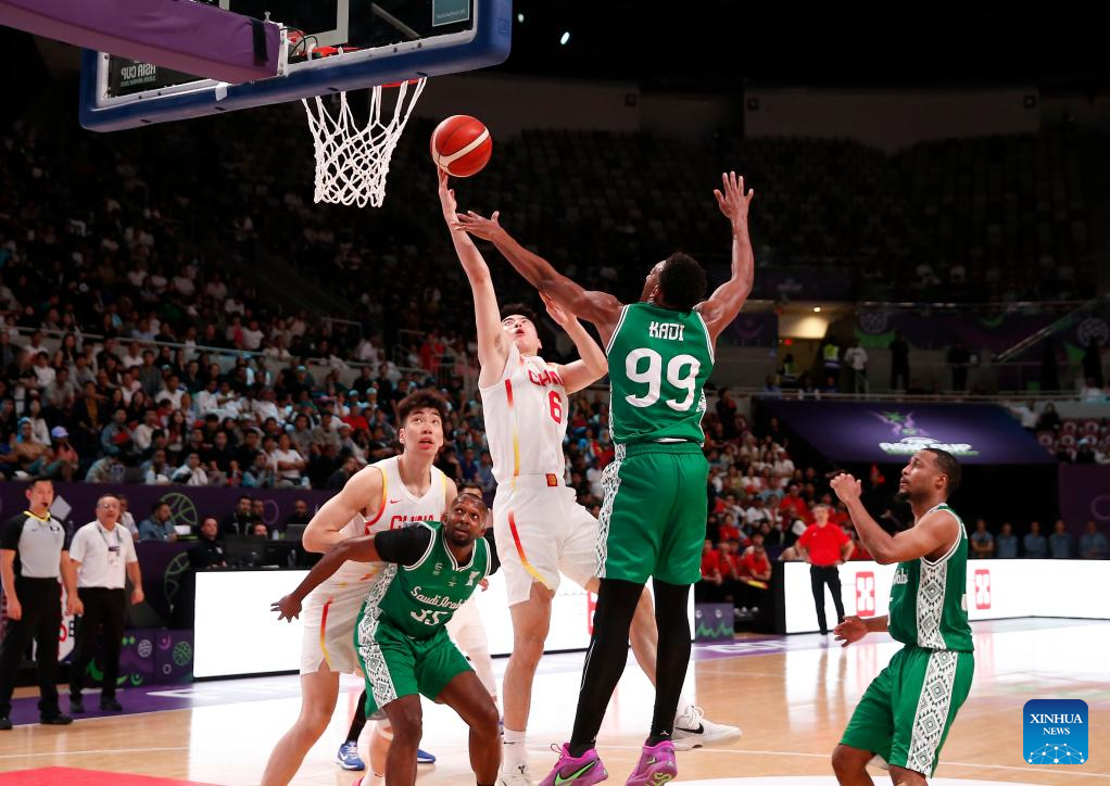 Cheng Shuaipeng (C) of China goes up to make a basket during the Group C match between China and Saudi Arabia at the FIBA Asia Cup 2025 in Jeddah, Saudi Arabia, Aug. 5, 2025. (Xinhua/Wang Dongzhen)