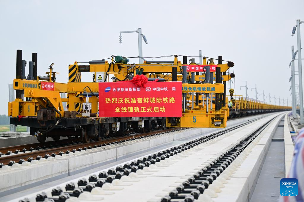 This photo taken on Aug. 6, 2025 shows the track laying construction site of an intercity railway in east China's Anhui Province. The first section of the track, a part of the intercity railway linking Huaibei, Suzhou and Bengbu City in Anhui Province, started track-laying work on Wednesday. (Xinhua/Zhou Mu)