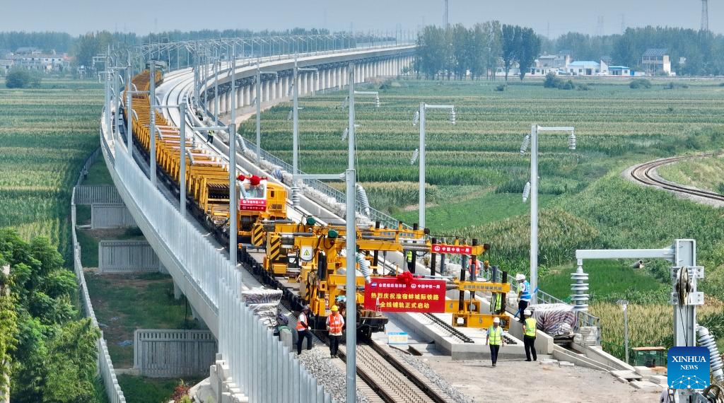 An aerial drone photo taken on Aug. 6, 2025 shows the track laying construction site of an intercity railway in east China's Anhui Province. The first section of the track, a part of the intercity railway linking Huaibei, Suzhou and Bengbu City in Anhui Province, started track-laying work on Wednesday. (Xinhua/Zhou Mu)