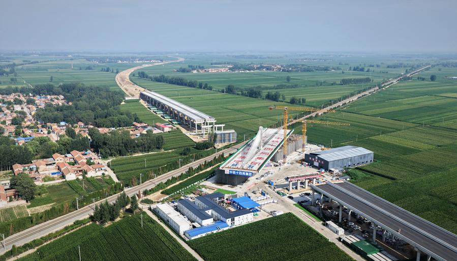 DEZHOU, Aug. 7 (Xinhua) -- A 23,500 tonnes cable-stayed bridge, part of the highway linking Dezhou of east China's Shandong Province and Shangrao of east China's Jiangxi Province, was rotated to its target position on Wednesday.