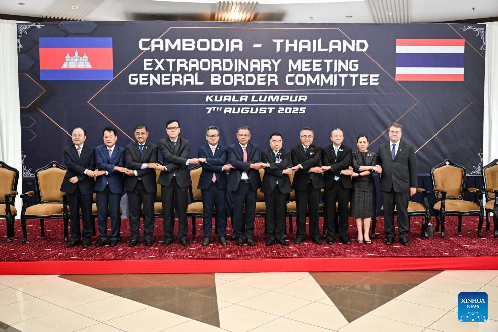 Representatives pose for a group photo before an extraordinary General Border Committee (GBC) meeting in Kuala Lumpur, Malaysia, Aug. 7, 2025. Cambodia and Thailand on Thursday signed an agreement on ceasefire arrangements, representatives of the two countries said after an extraordinary General Border Committee (GBC) meeting held in the Malaysian capital. (Xinhua/Cheng Yiheng)