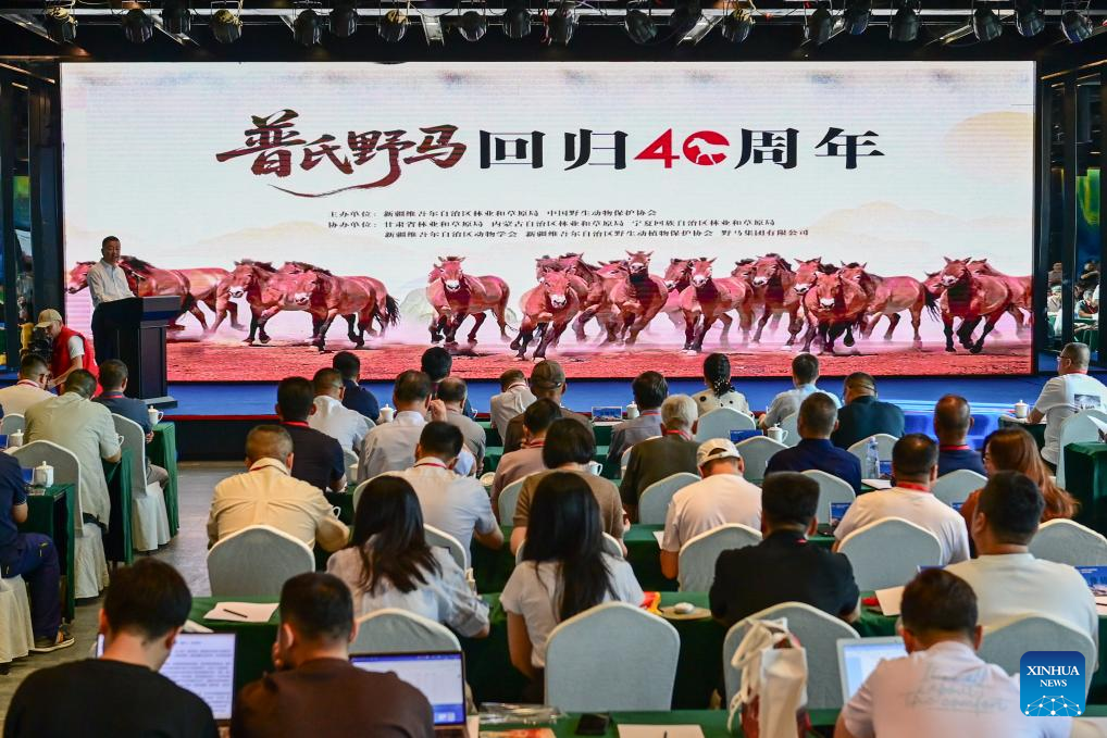 An event marking 40 years since Przewalski's horses' reintroduction to China is held in Urumqi, northwest China's Xinjiang Uygur Autonomous Region, Aug. 6, 2025. The population of Przewalski's horses in China has surpassed 900, accounting for one-third of the global total, according to officials. The details were announced at a recent event in Urumqi, northwest China's Xinjiang Uygur Autonomous Region, marking 40 years since the species was reintroduced to China. The growth in the horse's population in China has been internationally recognized as a successful model for species reintroduction. (Xinhua/Ding Lei)