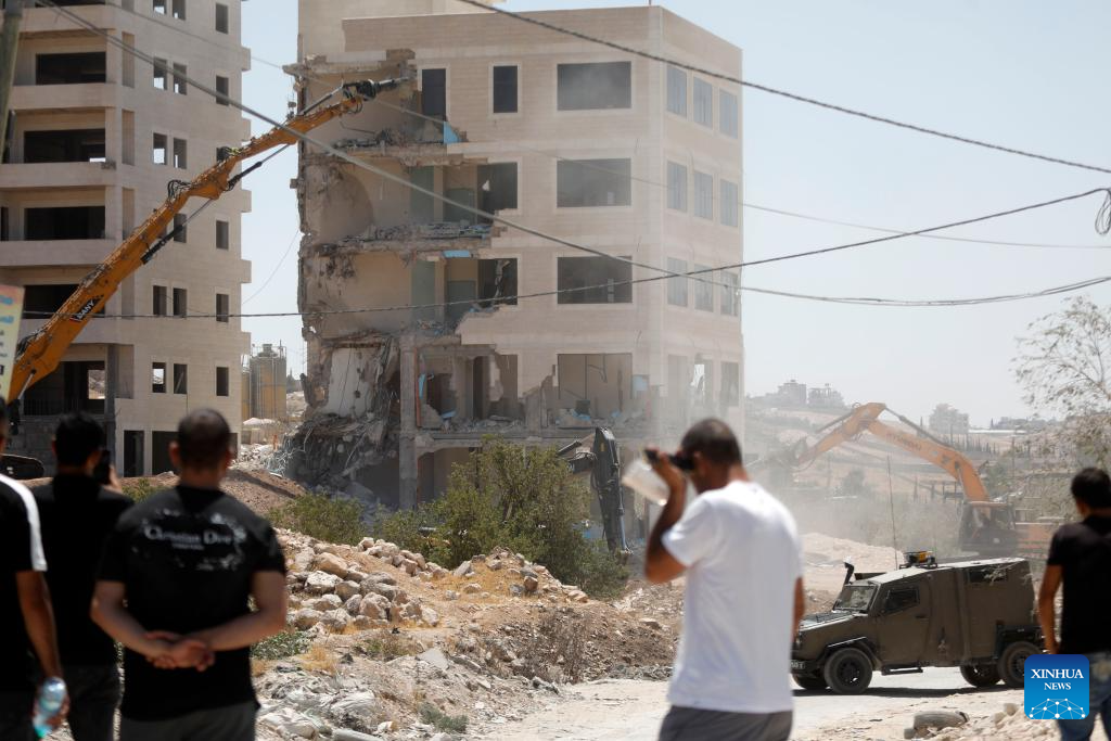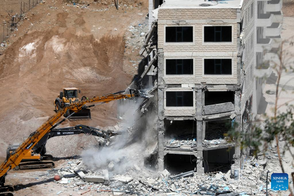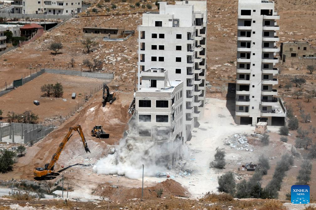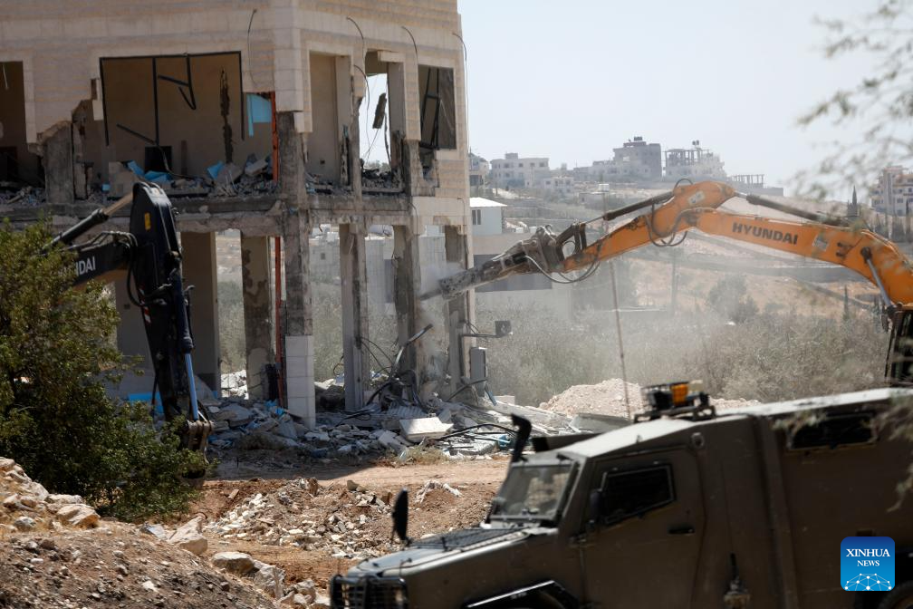 Israeli excavators demolish a building near Dar Salah, east of Bethlehem, in the southern West Bank, on Aug. 6, 2025. (Photo by Mamoun Wazwaz/Xinhua)