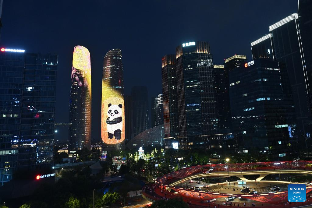 Photo taken on Aug. 7, 2025 shows the night view of the twin towers and Jiaozi Ring pedestrian bridge in Chengdu Financial City area on the day of the opening ceremony of the World Games 2025 in Chengdu, southwest China's Sichuan Province. (Xinhua/Yang Wenbin)
