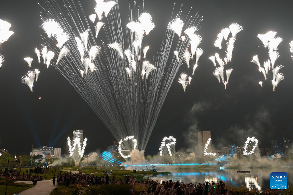 Fireworks are seen during the opening ceremony of the World Games 2025 in Chengdu, southwest China's Sichuan Province, on Aug. 7, 2025. (Xinhua/Xu Suhui)