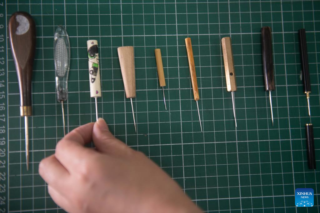 Book restorer Geng Ning introduces tools for book restoration at Anhui Provincial Library in Hefei, east China's Anhui Province, June 4, 2025. (Xinhua/Zhang Duan)