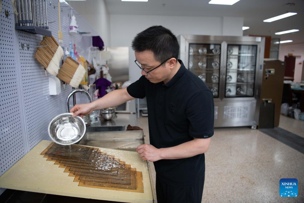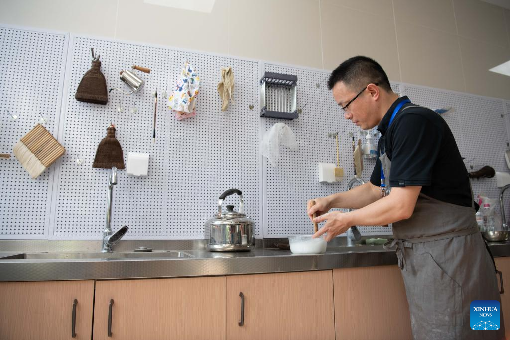 Book restorer Zang Chunhua mixes paste for restoration of books at Anhui Provincial Library in Hefei, east China's Anhui Province, Aug. 5, 2025. (Xinhua/Zhang Duan)