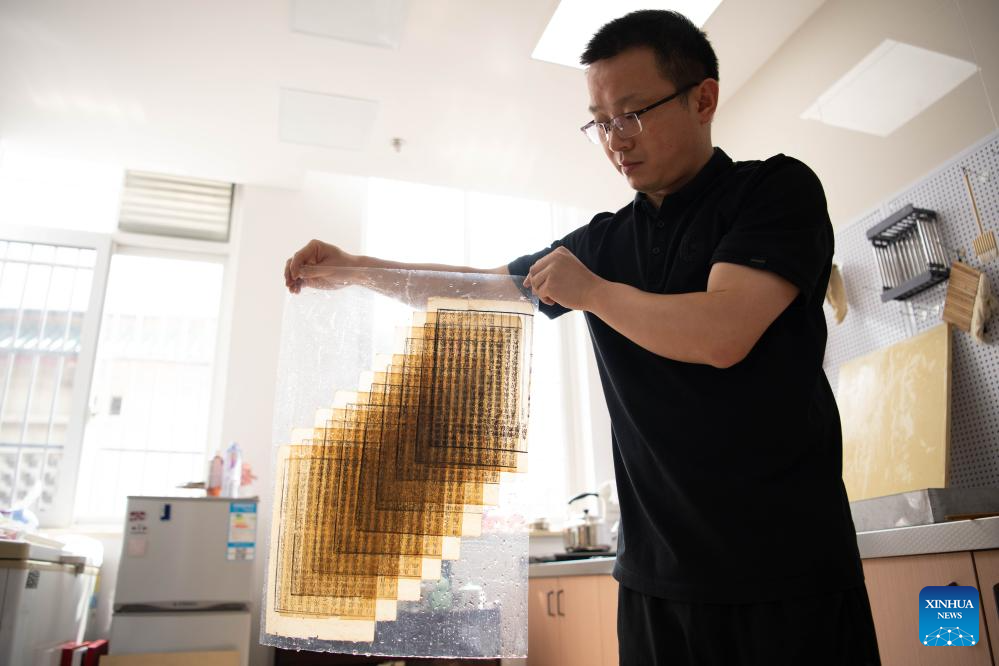 Book restorer Zang Chunhua dries pages of ancient books at Anhui Provincial Library in Hefei, east China's Anhui Province, Aug. 5, 2025. (Xinhua/Zhang Duan)