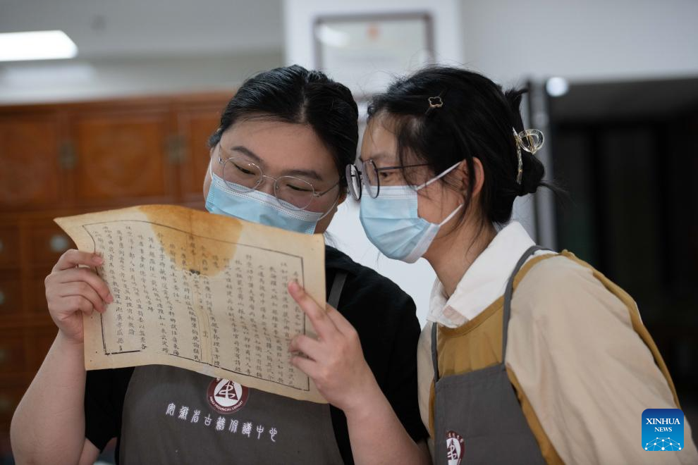 Book restorers Zhang Wenwen (R) and Jin Xin discuss during restoration work at Anhui Provincial Library in Hefei, east China's Anhui Province, June 17, 2025. (Xinhua/Zhang Duan)