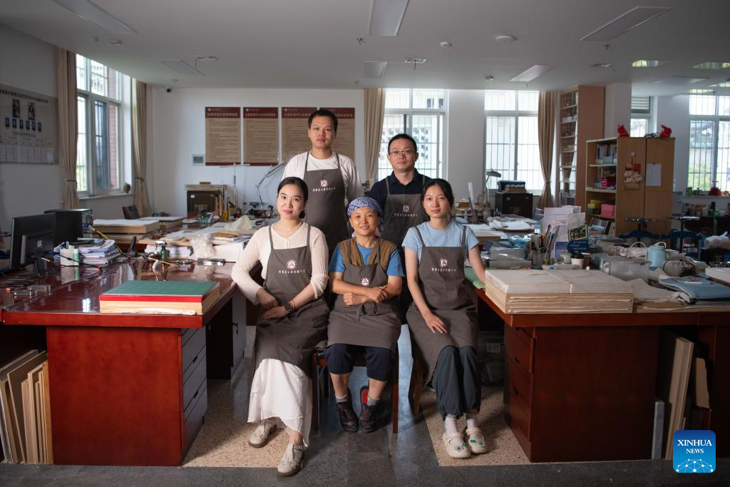 Book restorers Geng Ning, Zhou Yahan, Zhang Wenwen (front, from L to R), Jin Xin and Zang Chunhua (rear, from L to R) pose for a group photo at Anhui Provincial Library in Hefei, east China's Anhui Province, June 17, 2025. (Xinhua/Zhang Duan)