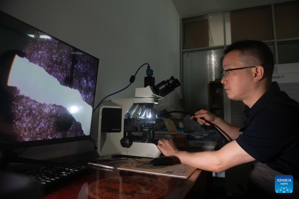 Book restorer Zang Chunhua checks the fiber of a page with professional device at Anhui Provincial Library in Hefei, east China's Anhui Province, June 4, 2025. (Xinhua/Zhang Duan)
