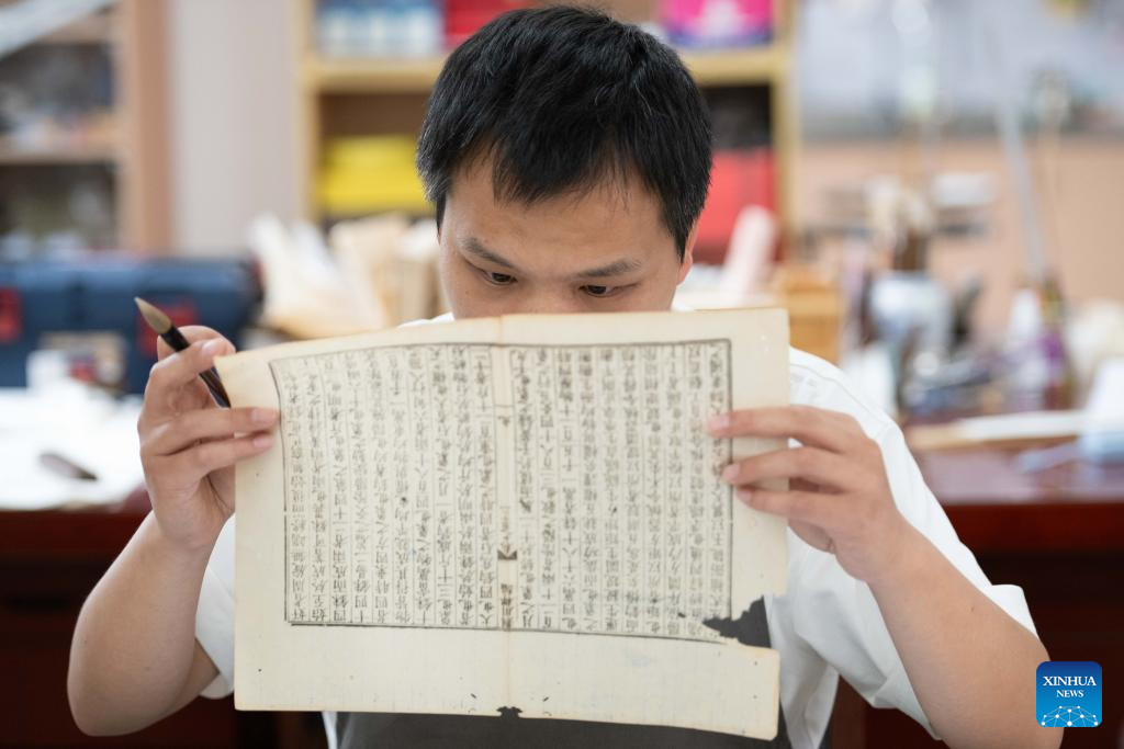 Book restorer Jin Xin restores a book at Anhui Provincial Library in Hefei, east China's Anhui Province, June 24, 2025. (Xinhua/Zhang Duan)