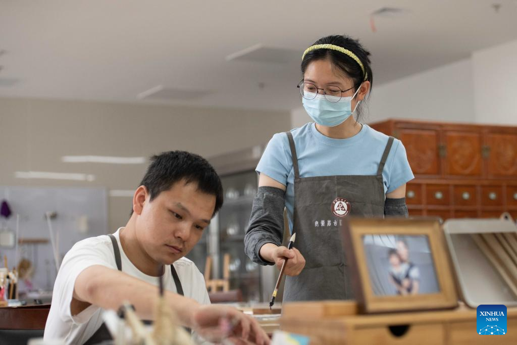 Book restorer Zhou Yahan (front, R) demonstrates restoration techniques at Anhui Provincial Library in Hefei, east China's Anhui Province, June 4, 2025. (Xinhua/Zhang Duan)