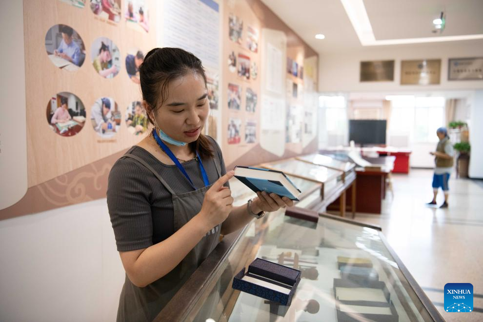 Book restorer Geng Ning introduces binding types of books at Anhui Provincial Library in Hefei, east China's Anhui Province, Aug. 5, 2025. (Xinhua/Zhang Duan)