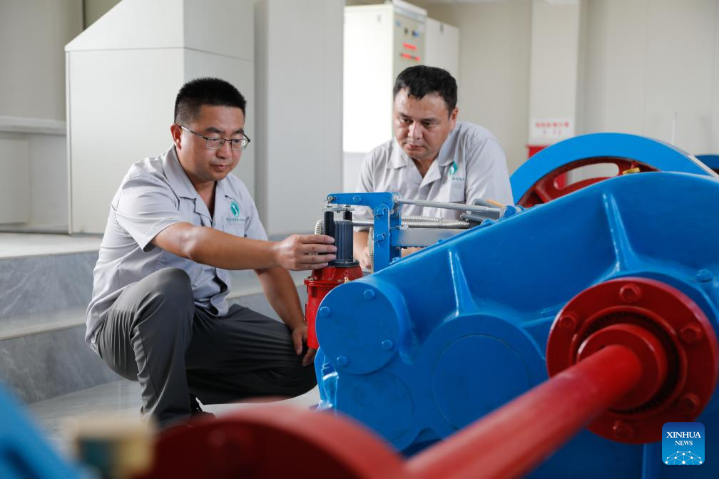 Staff members inspect the brake of a hoist at the discharging gate house of the Daxihaizi Reservoir in Yuli County, northwest China's Xinjiang Uygur Autonomous Region, on Aug. 6, 2025. The Daxihaizi Reservoir is the last reservoir in the lower reaches of the main stream of the Tarim River. Currently, the water storage of the reservoir has reached 40 million cubic meters, meeting the conditions for water persion, as part of an ecological conservation project. (Photo by Wang Zhipeng/Xinhua)