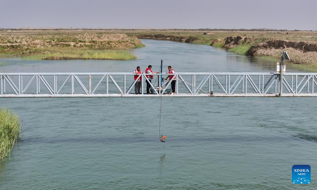 Staff members monitor the discharged flow of water in Yuli County, northwest China's Xinjiang Uygur Autonomous Region, on Aug. 6, 2025. The Daxihaizi Reservoir is the last reservoir in the lower reaches of the main stream of the Tarim River. Currently, the water storage of the reservoir has reached 40 million cubic meters, meeting the conditions for water diversion, as part of an ecological conservation project. (Photo by Wang Zhipeng/Xinhua)