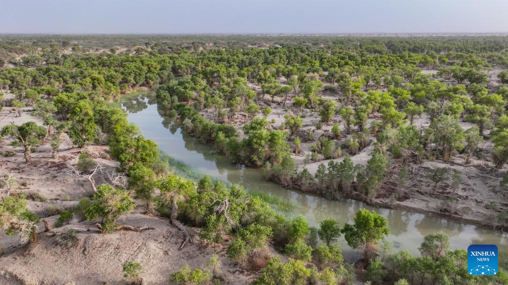 An aerial drone photo taken on Aug. 6, 2025 shows the populus euphratica forest in Yuli County, northwest China's Xinjiang Uygur Autonomous Region. The Daxihaizi Reservoir is the last reservoir in the lower reaches of the main stream of the Tarim River. Currently, the water storage of the reservoir has reached 40 million cubic meters, meeting the conditions for water diversion, as part of an ecological conservation project. (Photo by Wang Zhipeng/Xinhua)