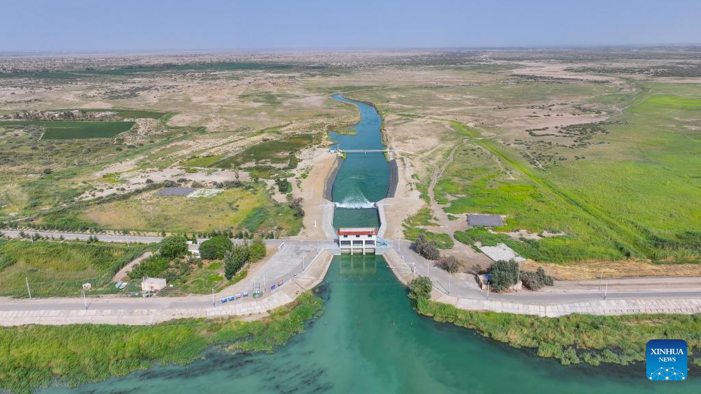 A drone photo taken on Aug. 6, 2025 shows water flowing from the Daxihaizi Reservoir into the river course in Yuli County, northwest China's Xinjiang Uygur Autonomous Region. The Daxihaizi Reservoir is the last reservoir in the lower reaches of the main stream of the Tarim River. Currently, the water storage of the reservoir has reached 40 million cubic meters, meeting the conditions for water diversion, as part of an ecological conservation project. (Xinhua)