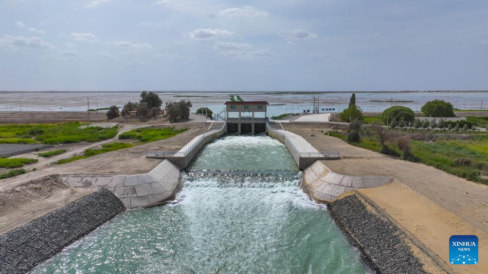 An aerial drone photo taken on Aug. 6, 2025 shows water flowing from the Daxihaizi Reservoir into the river course in Yuli County, northwest China's Xinjiang Uygur Autonomous Region. The Daxihaizi Reservoir is the last reservoir in the lower reaches of the main stream of the Tarim River. Currently, the water storage of the reservoir has reached 40 million cubic meters, meeting the conditions for water diversion, as part of an ecological conservation project. (Xinhua)