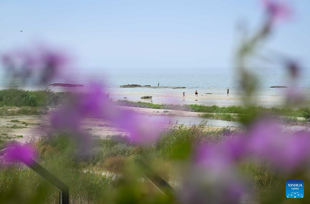 People enjoy themselves on the beach in Aktau, Kazakhstan, on Aug. 5, 2025. (Xinhua/Li Renzi)