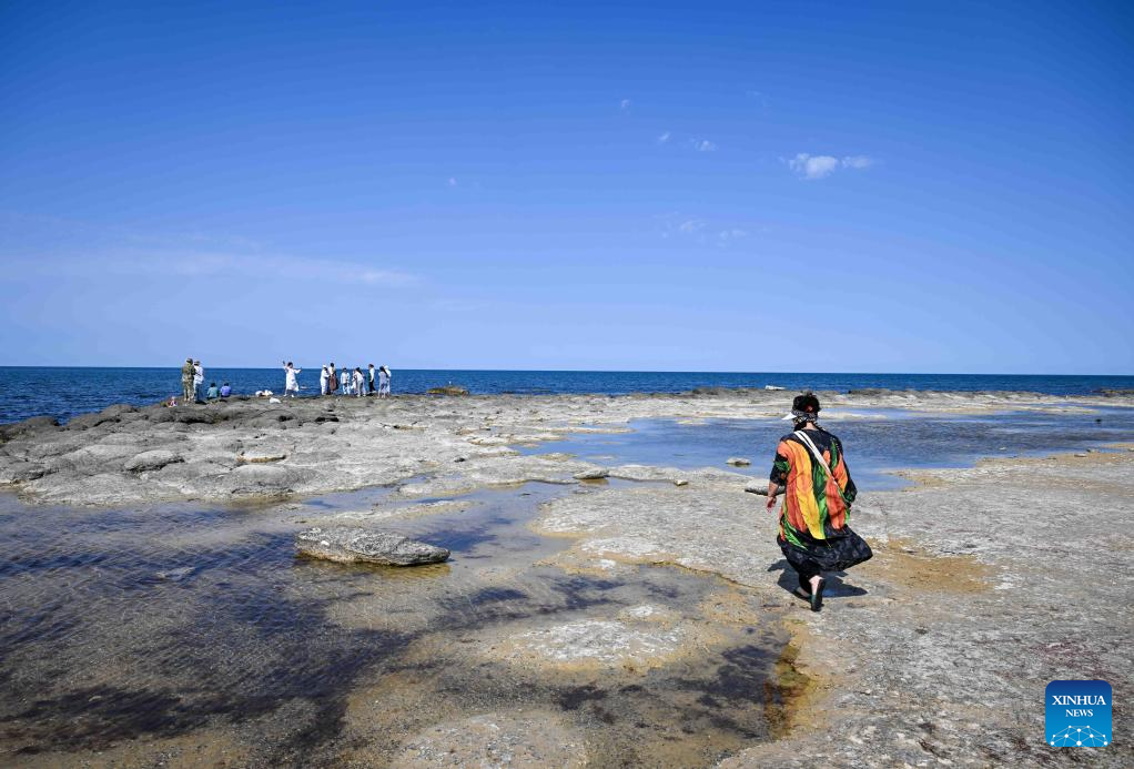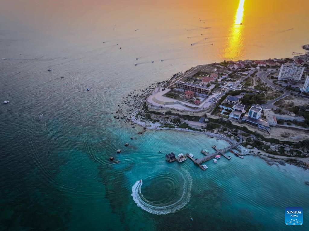 An aerial drone photo taken on Aug. 5, 2025 shows the Caspian Sea coast scenery in Aktau, Kazakhstan. (Xinhua/Li Renzi)