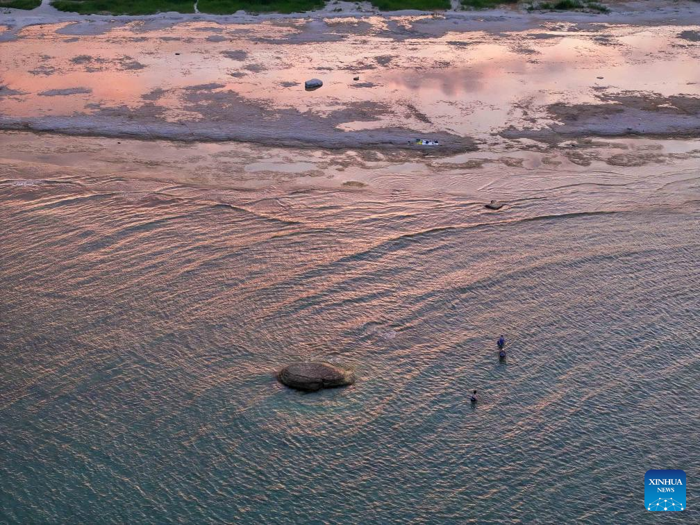 An aerial drone photo shows people enjoying themselves in the early morning hours on the beach in Aktau, Kazakhstan, on Aug. 5, 2025. (Xinhua/Li Renzi)